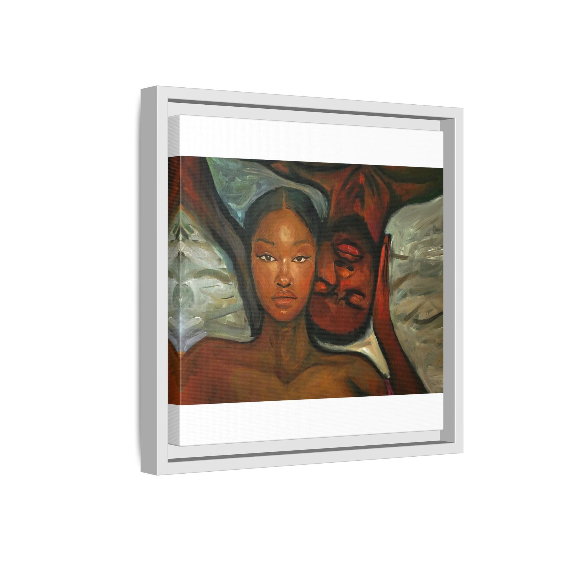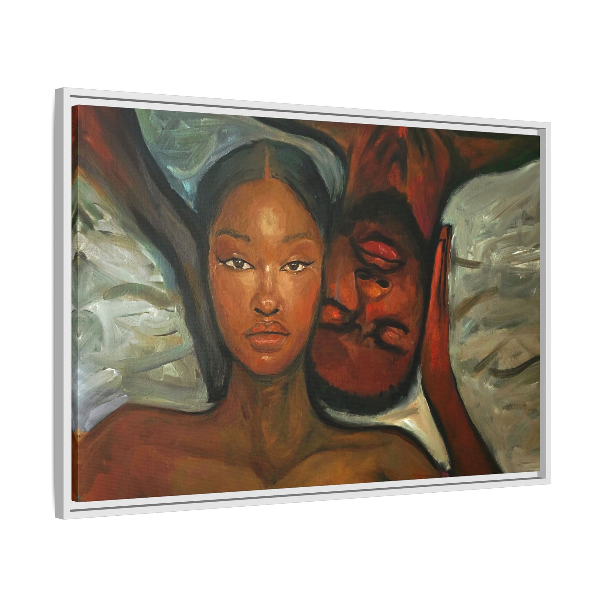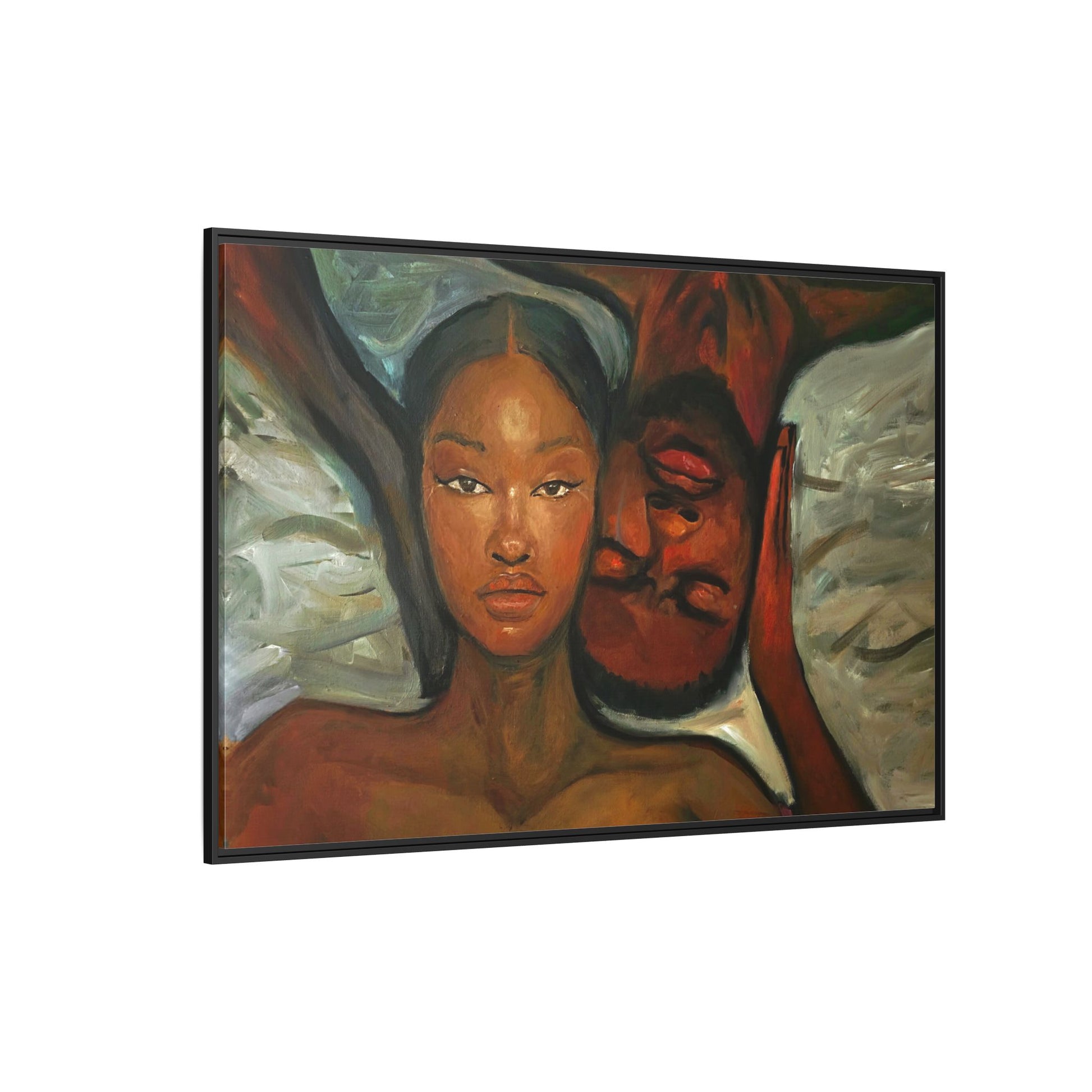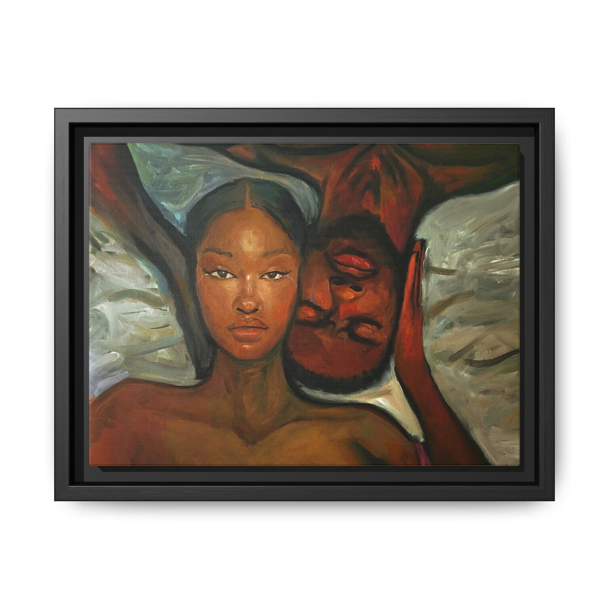 A emotional oil painting with a man and woman laying in bed, perfect for adding a touch of emotion and art to your space. This canvas print is ideal for art lovers and individuals looking to bring unique artwork into their homes. Great for gifting on Valentine's Day, anniversaries, or as a housewarming present.