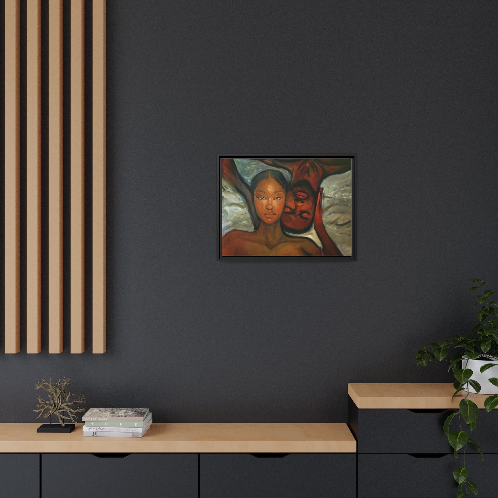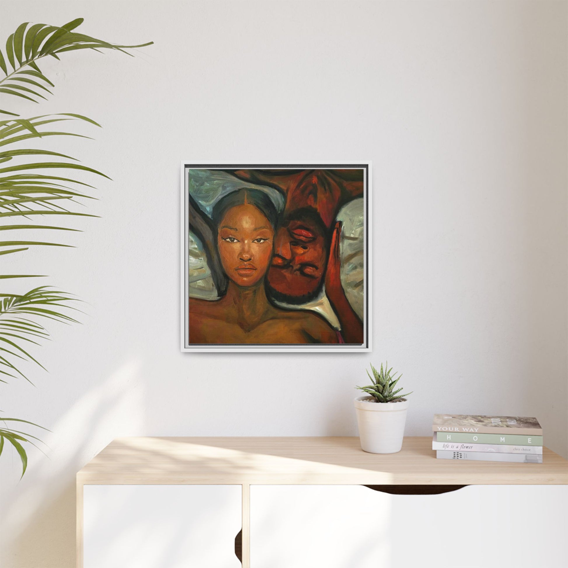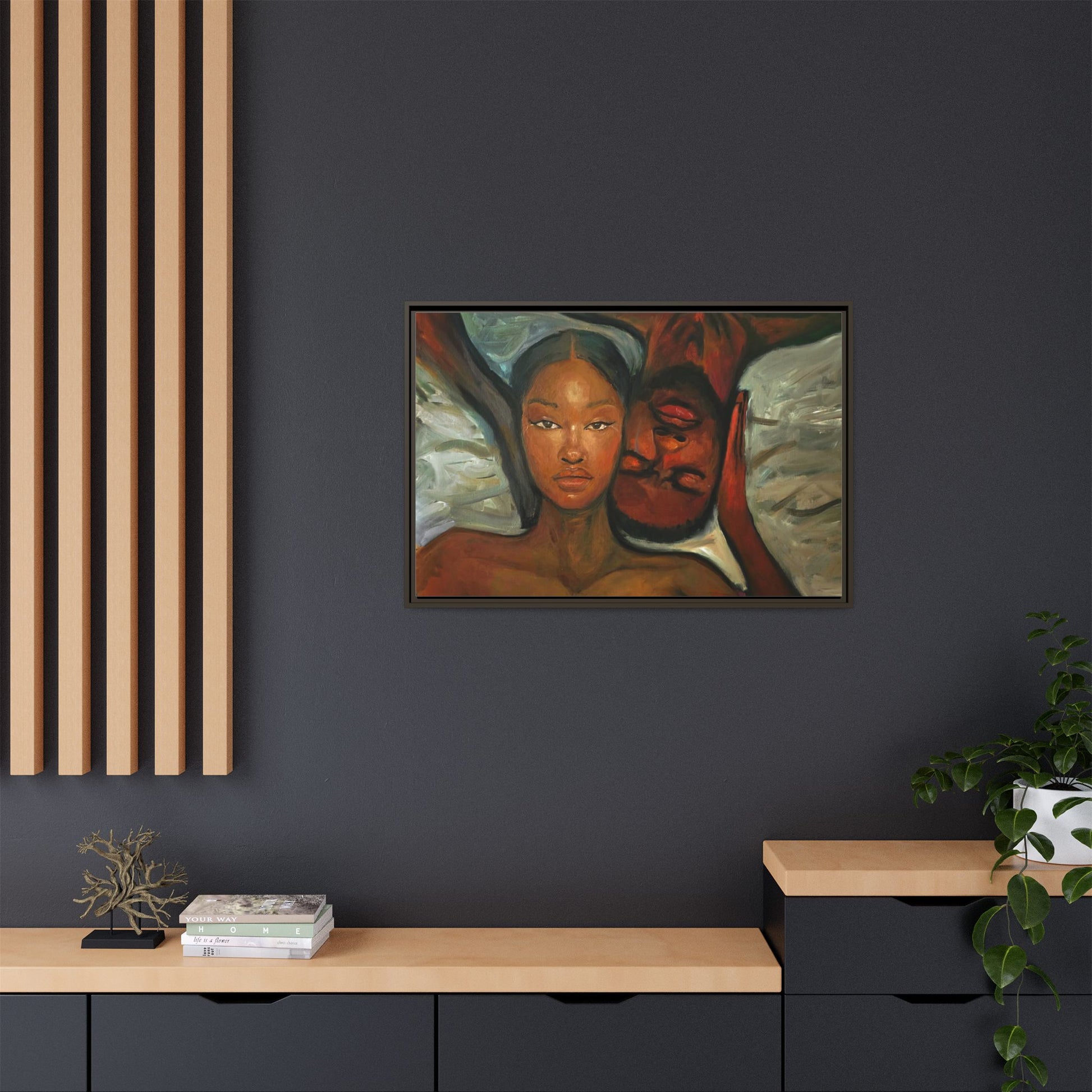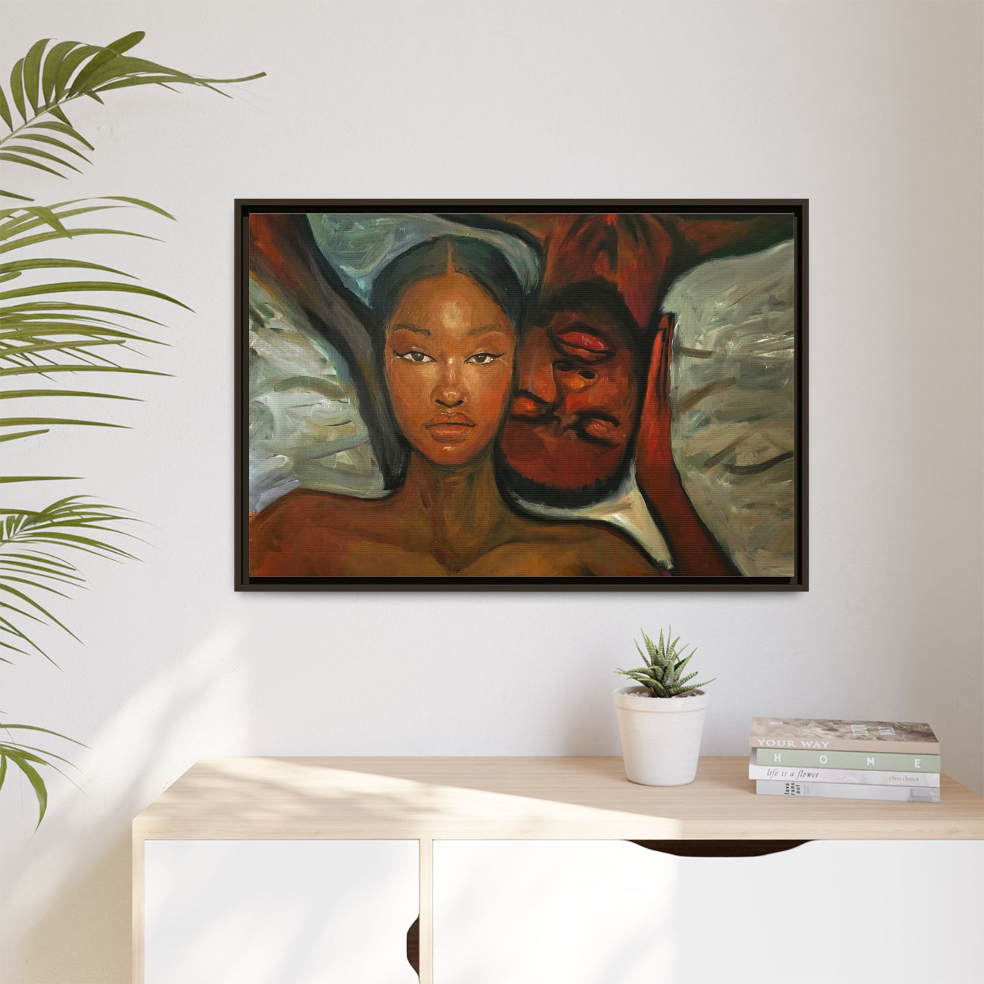 A emotional oil painting with a man and woman laying in bed, perfect for adding a touch of emotion and art to your space. This canvas print is ideal for art lovers and individuals looking to bring unique artwork into their homes. Great for gifting on Valentine's Day, anniversaries, or as a housewarming present.